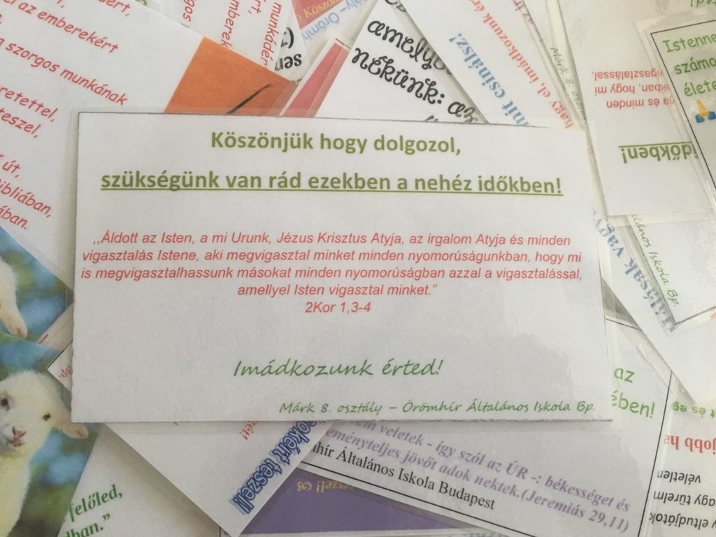A szeretetet semmi sem állíthatja meg! Felsőseink a veszélyhelyzetben hálakártyákat készítettek, hogy megköszönjék a sok áldozatos munkát, és bátorítsák a járvány idején a frontvonalon dolgozókat. A posta el is vitte kórházakba, mentőállomásokra, üzletekbe a kis üzeneteket. Az alsósok sem voltak tétlenek, az 1. osztályosok például kézzel készített húsvéti üdvözlőlapokkal lepték meg két gyermekklinika személyzetét is. Az Élet győz!